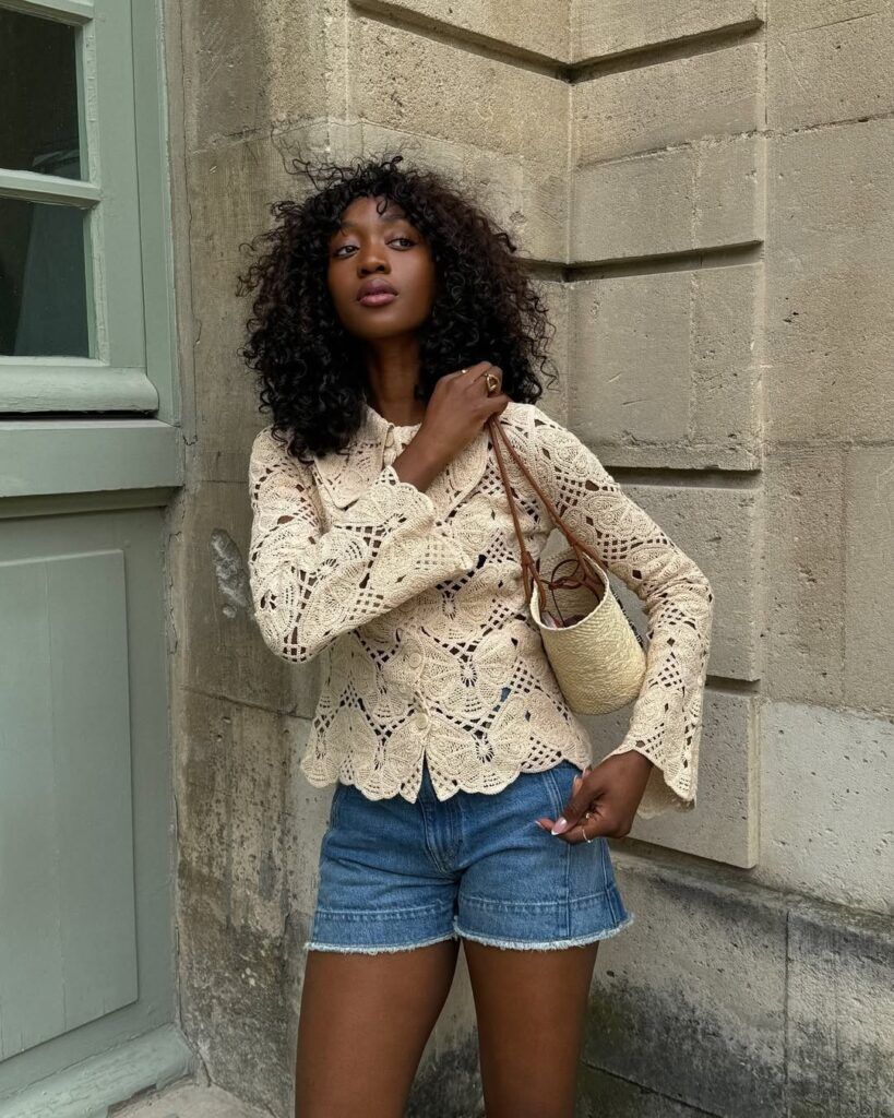 A crochet or lace-style top paired with simple denim shorts focuses on texture contrast to build visual appeal. The detailed top becomes the focal point, while the shorts remain understated to avoid distraction. Neutral-toned accessories, such as a woven bag, complement the soft tones of the outfit. This approach shows how denim shorts outfits can feel elevated through fabric choice rather than bold styling.