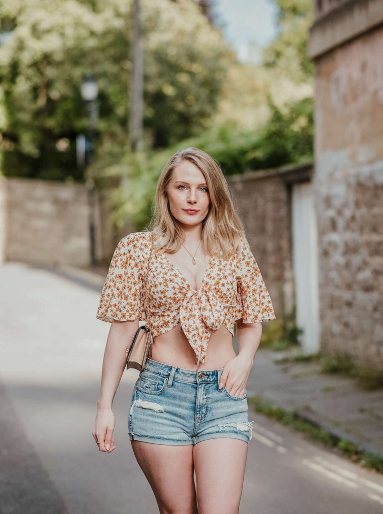 A knotted floral blouse paired with light-wash distressed denim shorts creates a structured yet relaxed outfit. The tie-front detail adds shape and draws attention to the waist, while the floral pattern introduces color and interest. A simple crossbody bag and minimal jewelry help maintain balance without overpowering the look. This combination highlights how denim shorts outfits can achieve a polished appearance by letting patterned tops stand out against neutral denim.