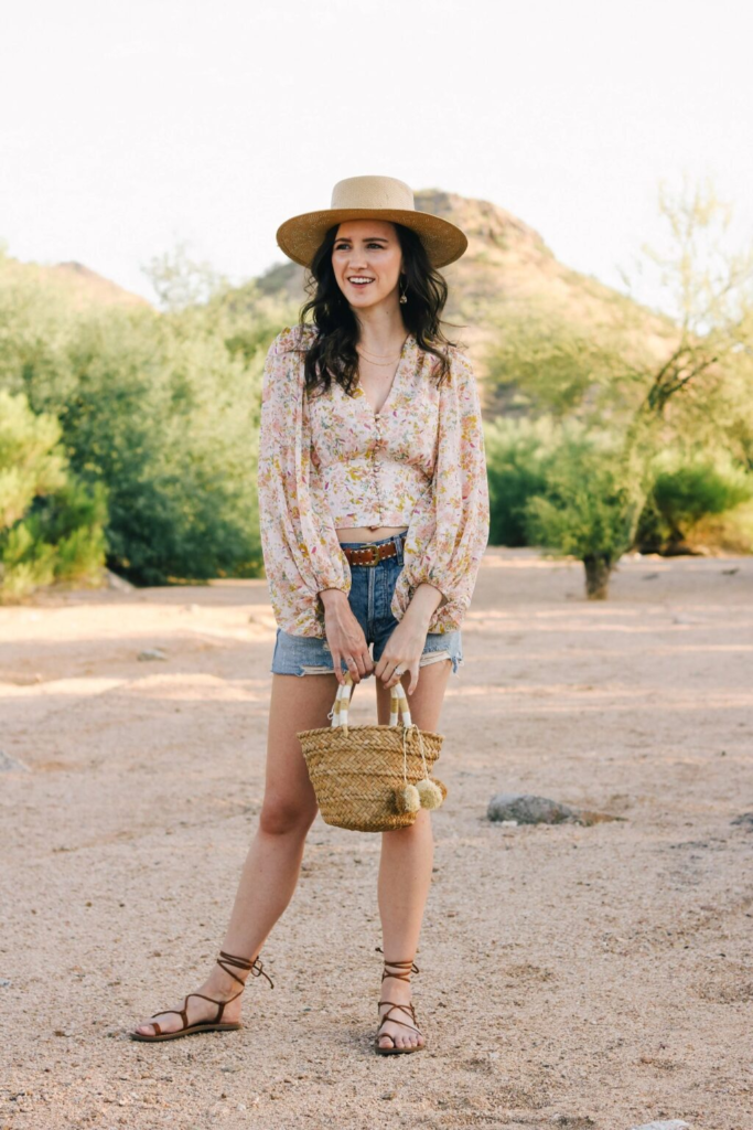 A floral wrap top combined with distressed denim shorts introduces a relaxed, nature-inspired aesthetic. The print adds visual softness, while the denim keeps the look grounded and practical for outdoor activities. Accessories such as a straw tote and wide-brim hat complement the theme, making the outfit suitable for casual adventures. This example shows how denim shorts outfits can feel cohesive when natural textures and prints are layered together thoughtfully.