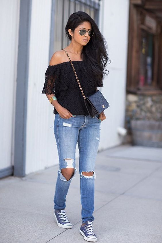 This outfit mixes soft and edgy elements. A lace top adds detail, while distressed jeans keep it casual.
