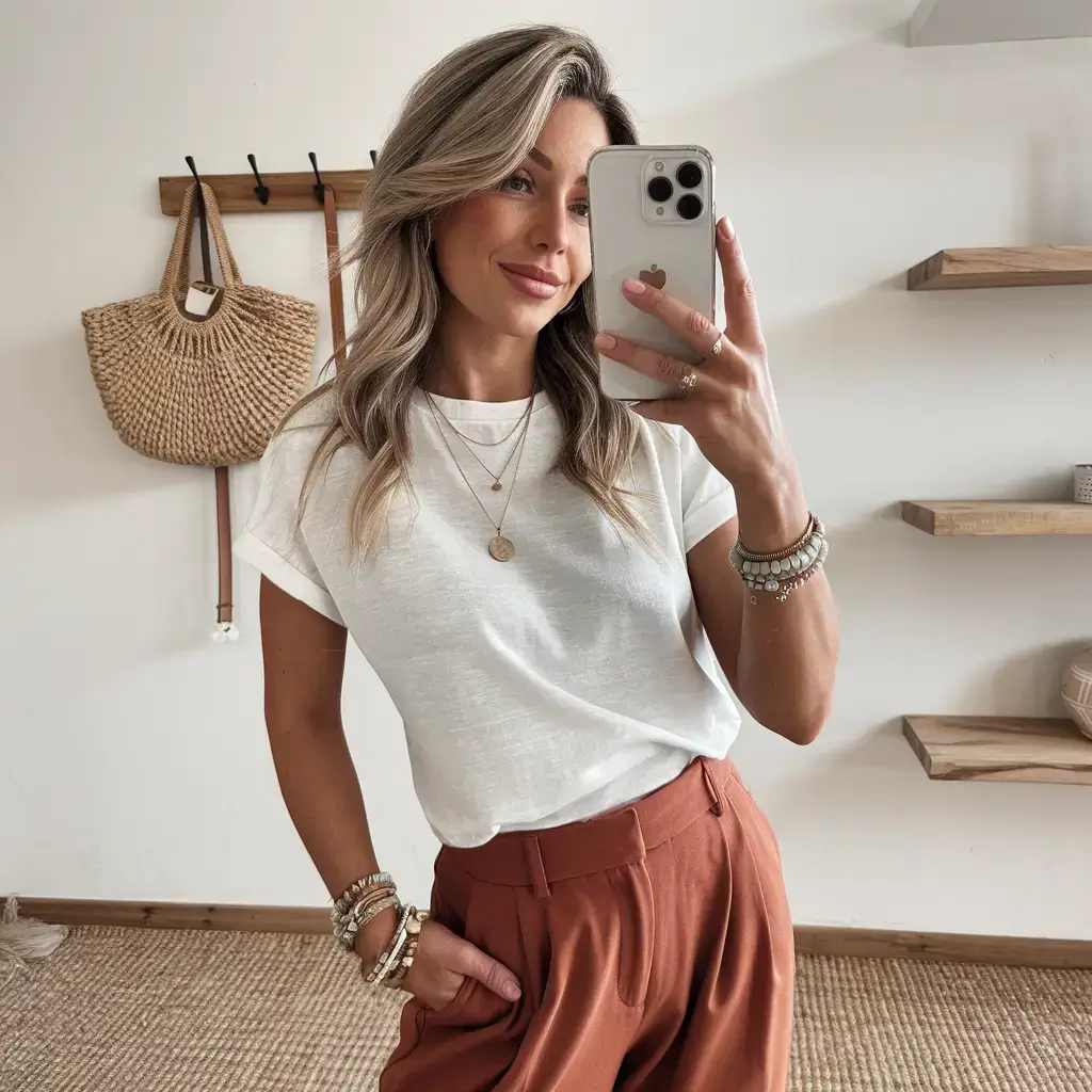 A cream linen tee that drapes well without being sheer is one of those wardrobe pieces that quietly earns its keep all summer. Paired with rust-colored pleated trousers that flow and flatter without overdoing it, the combination lands in that elevated ease category polished enough to look intentional, relaxed enough to feel like you barely tried.