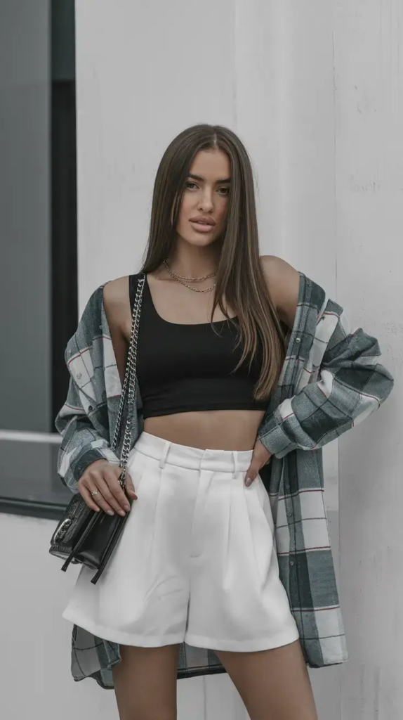 An all-black crop top with white pleated shorts and a plaid flannel shirt casually layered over the top brings together edgy and minimal in a way that works perfectly for early June evenings. The contrast between the black top and white shorts is sharp and the flannel adds a relaxed, grunge-adjacent layer that handles any temperature drop without disrupting the overall aesthetic. The shorts are the key piece here — high-waisted, well-fitting, and slightly loose so the proportions stay balanced. This is an outfit that holds up well at concerts, rooftop gatherings, and any summer evening where you want to feel like the most stylish version of yourself. High-top sneakers or platform sandals both work well as footwear choices and either direction fits the energy of this look naturally.