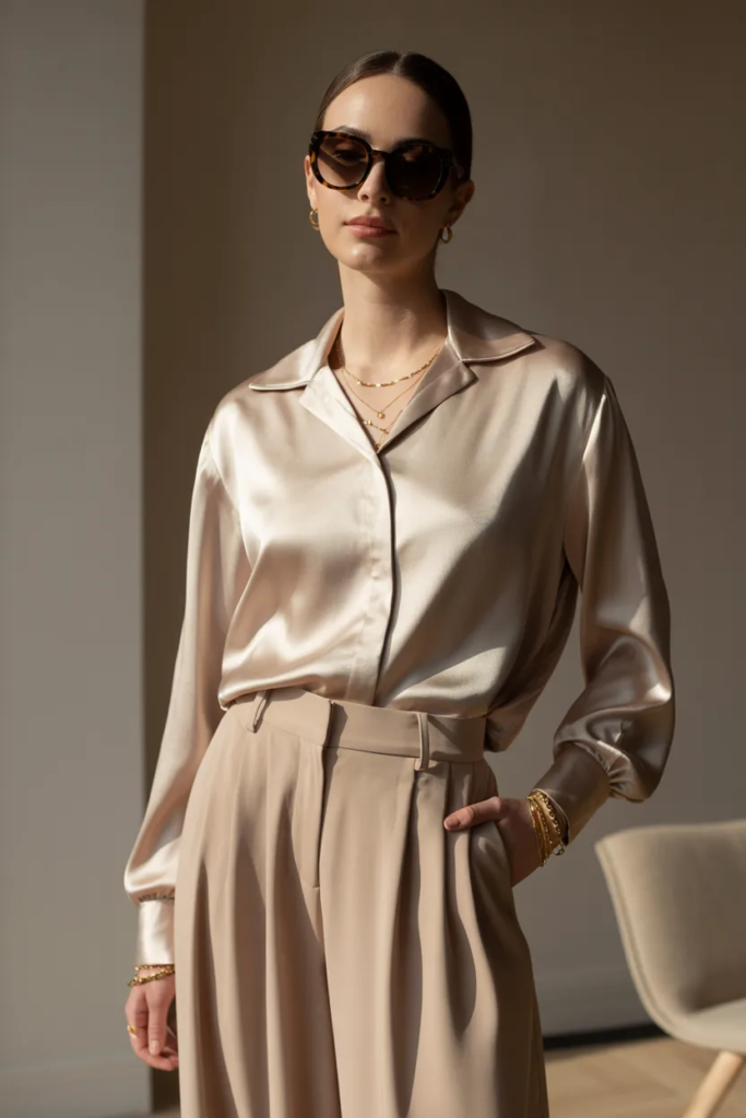 A clean satin blouse tucked into wide-leg flowing trousers in a matching neutral tone creates an all-one-color look that communicates genuine confidence rather than a lack of decision. The satin fabric has enough shape to handle work settings or casual café days equally and the high-waisted trousers lengthen the silhouette while moving like comfortable loungewear. Stacked gold jewelry and oversized sunglasses complete the look without pushing it into overdone territory. The combination of satin and crepe adds textural interest to what is otherwise a single-color palette and the result is quiet luxury that speaks clearly without any noise. A raffia clutch or a bright red manicure would add a pop if needed but the outfit is beautiful and complete as it already is.