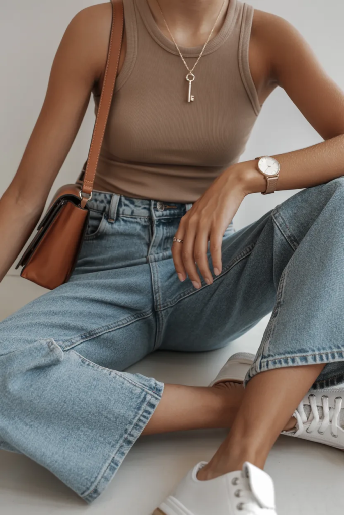 A ribbed tank top worn with vintage-washed straight-leg slightly cropped jeans is one of those combinations that proves the most satisfying outfits are often the simplest ones. The tank fits well and the jeans have enough of a clean vintage quality to elevate the whole look beyond basic. A brown crossbody bag, a simple key pendant, and a small watch add just enough polish without losing the cool effortless quality that makes this work. This is an outfit for days when you do not want to think too hard but still want to feel like yourself — styled but never overdone. Sneakers push it sporty, sandals make it more considered, and a linen blazer with a bright lip takes it into evening territory cleanly. It is one of the most versatile june 2026 outfits you’ll live in across the full range of summer days.