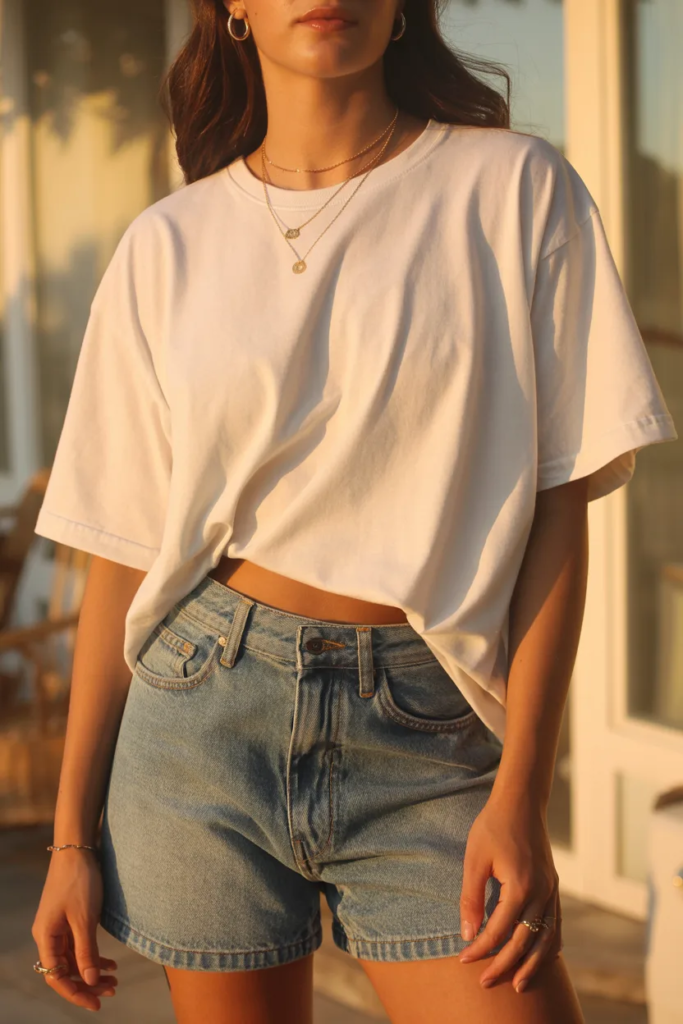 An oversized white tee with high-waisted denim cutoffs is summer dressing at its most honestly comfortable. The proportions work because the relaxed tee against the fitted shorts creates a balance that looks intentional and the lightness of both pieces means nothing sticks or feels heavy in June heat. This is the outfit for slow porch mornings, iced matcha runs with friends, and beach road trips that start early and end after sunset. The slightly undone quality of the look is part of what makes it feel right — it is nostalgic in the way that only the most comfortable summer outfits manage to be. Tying the tee at the waist or layering it over a bikini top both work as easy variations and layered necklaces or silver hoops add the right finishing touch for evenings.