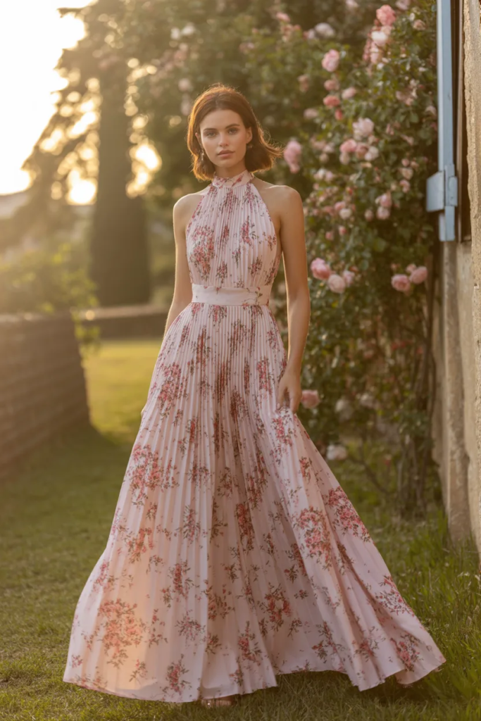 A floral halter dress with a pleated waist and full skirt is the kind of piece that captures everything June should feel like — light, romantic, and completely unhurried. The soft pink vintage-inspired print gives it a quality that belongs in a French film and the high neckline adds enough sophistication to stop it from being too sweet. This dress works barefoot in the backyard and with nude heels at a dinner without needing any significant styling adjustment between the two. A straw bag or a cardigan for cooler evenings are easy additions if needed. On its own it is already a complete look and one of the most genuinely feminine june 2026 outfits you’ll live in throughout the entire month.