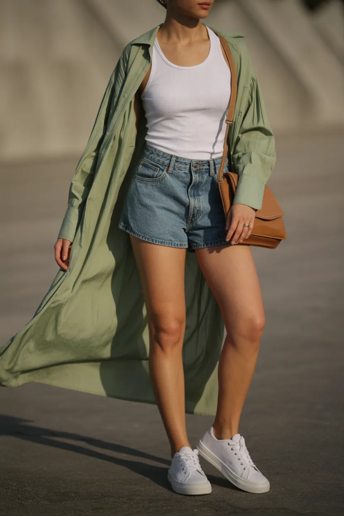 A white ribbed tank with high-waisted denim cutoff shorts and a sage green oversized longline shirt worn open on top is built for those June days that start warm and shift into something cooler by the time evening arrives. The longline shirt is the real hero here — it adds depth, movement, and warmth to what would otherwise be a standard shorts-and-tank combination and it handles the transition from afternoon to night air without any extra thought required. White sneakers and a warm-toned bag keep the accessories simple and clean. Platform sandals or layered silver jewelry would shift the look for evenings where you want a slightly more considered feel. This is exactly the kind of practical and stylish approach that makes june 2026 outfits you’ll live in genuinely useful across long summer days.