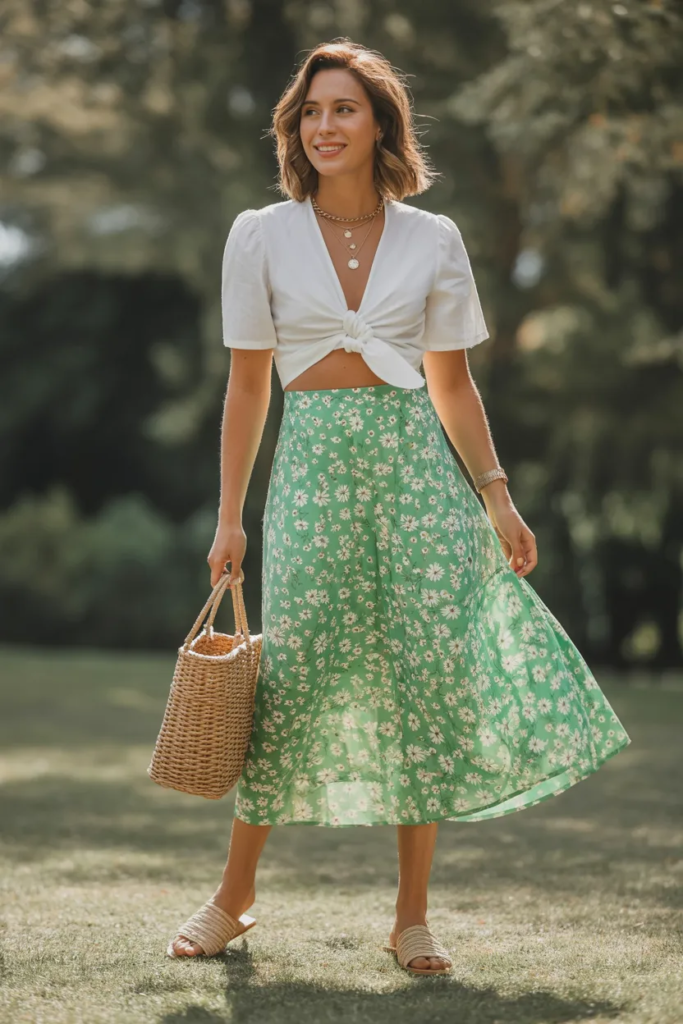 A white knotted crop top with a green midi skirt printed with tiny white florals is peak early June morning dressing — gentle, fresh, and impossibly light. The skirt has real movement and the daisy-style print has a nostalgic quality that never feels overdone. The knotted top adds structure and a playful touch and gold necklaces complete the look without adding any visual noise. This is an outfit that generates genuine warmth from people around you — not because of what it costs or how trend-forward it is, but because it looks happy. Leather slides or espadrilles and a woven market tote are the natural accessories and they fit the whole feel of the look seamlessly. It belongs in every june 2026 outfits you’ll live in rotation without any question.