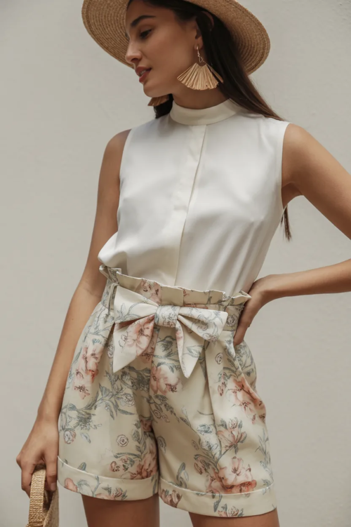 An ivory sleeveless top with high-waisted floral paperbag shorts creates a combination that is photogenic from every angle without requiring any particular posing or effort. The bow waist detail gives the shorts a playful quality and the floral print brings a contemporary vintage feel to the whole look. The sleeveless top provides the clean, crisp contrast the outfit needs to stay balanced rather than tipping into overly feminine territory. This is the kind of outfit that works across multiple settings by changing only the bag or the shoes — a raffia earring and a straw fedora take it further toward a vacation aesthetic when needed. Comfortable to wear, easy to style, and consistently flattering — exactly what june 2026 outfits you’ll live in should be.