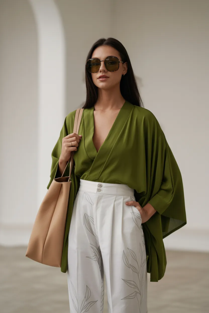 A deep olive kimono top with white leaf-patterned high-waisted trousers brings together relaxed drapery and a confident structure in a combination that is not typical of summer dressing — and that is exactly what makes it work so well. The bare neckline of the top adds a softer sensuality and the pleated trousers finish the look with an art-gallery quality that suits resort dinners and rooftop meetings equally. The proportions balance each other in a way that feels precise without ever looking stiff. Oversized sunglasses and a leather tote are all it takes to make this outfit fully ready for any June day that matters. It is an unexpected combination that delivers consistent results and earns its place firmly in the june 2026 outfits you’ll live in lineup.