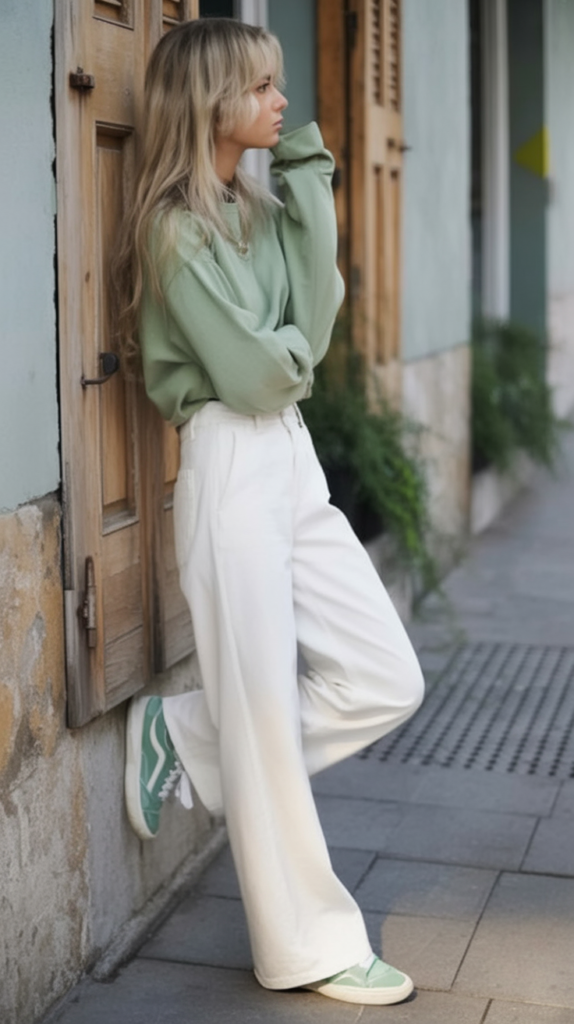 Soft green combined with warm white creates a relaxed and refreshing look. The color pairing feels calm and slightly playful, giving off an easygoing vibe that works well for laid-back days. It looks effortless while still appearing neat and intentional.