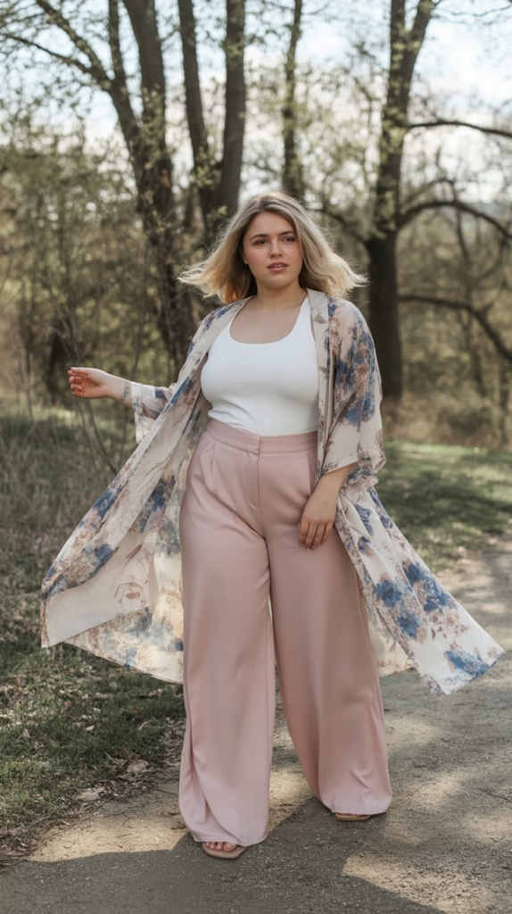 The open layers and gentle waist shape make this outfit flattering for many body types, including plus-size figures. It’s a good choice for spring or early summer and can easily fit into a simple capsule wardrobe with just a few key items.
