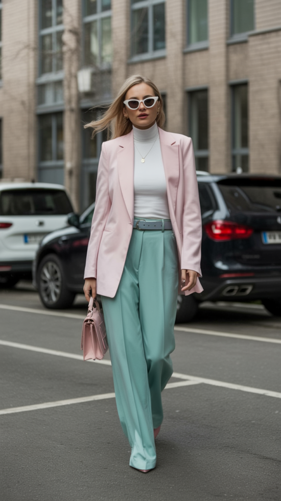 Pastel tones can feel strong and confident when paired with tailored pieces. This outfit looks professional and stylish while still feeling comfortable rather than overly formal.