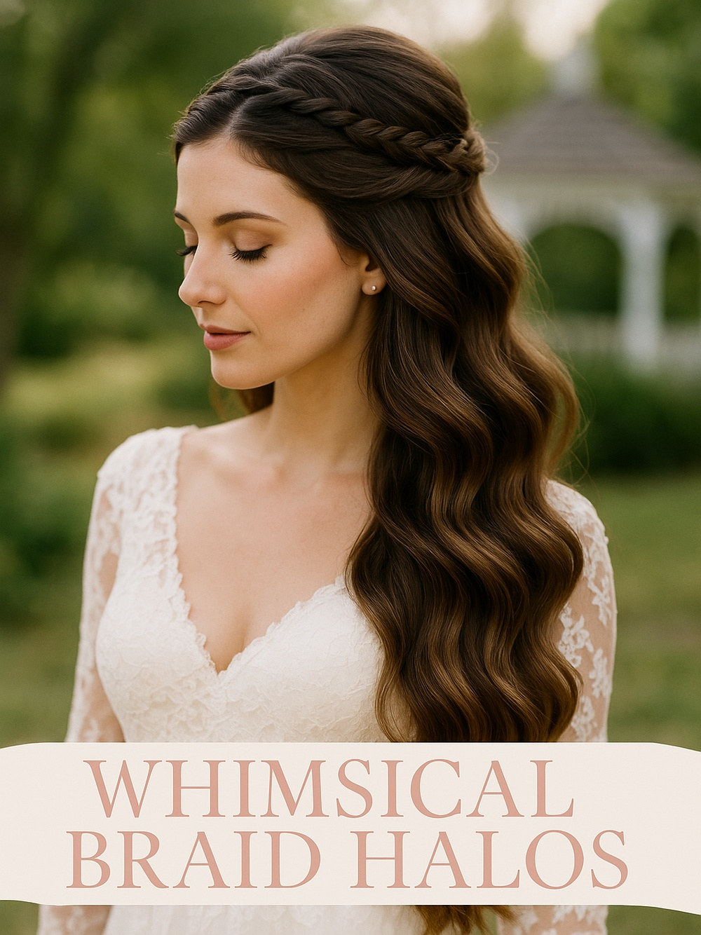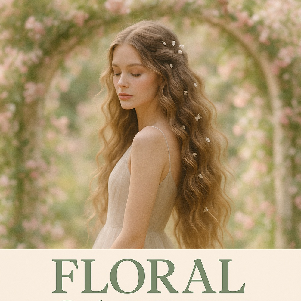 This hairstyle pairs soft waves with delicate flowers placed throughout the hair. The waves remain light and airy so the floral details stand out naturally. Small pins hold the flowers in place while maintaining the relaxed texture. The arrangement creates a gentle, nature-inspired effect. It is especially suitable for outdoor celebrations or springtime occasions.
