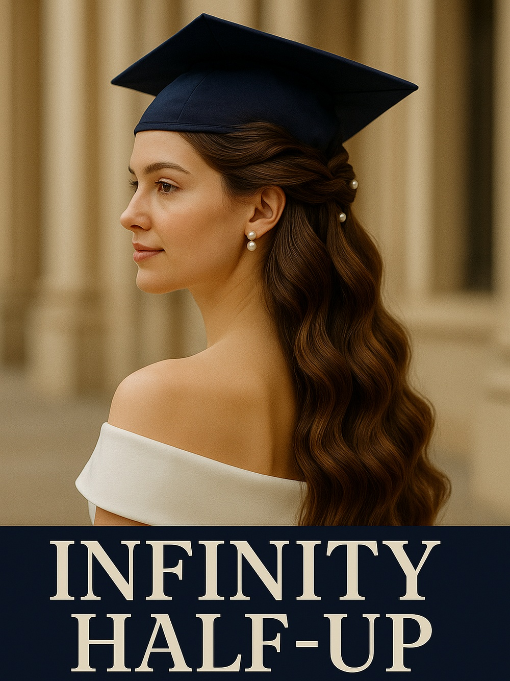 In this hairstyle, the crown section of the hair is styled into overlapping loops that resemble an infinity shape. The loops are secured while the remaining hair falls in loose waves over the shoulders. Decorative pearl pins highlight the crossing point of the loops. Light styling products maintain volume and texture. The look balances structure at the top with movement through the length.