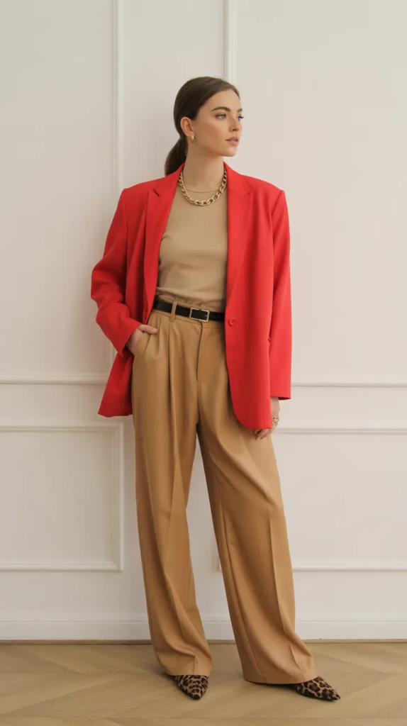 A bright blazer can instantly transform an early spring outfit, especially after months of darker winter clothing. A red blazer paired with neutral trousers creates a strong yet balanced combination.
