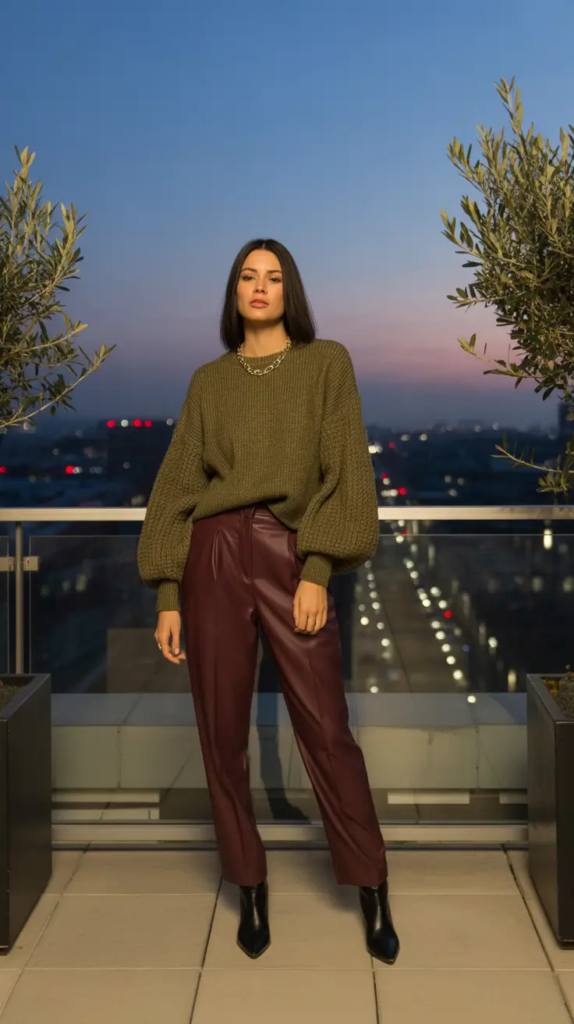 Leather pants bring sophistication to the outfit while remaining suitable for casual evening plans. Boots and minimal jewelry help maintain a sleek silhouette.