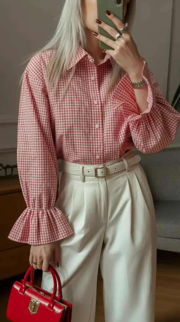 A gingham blouse paired with white trousers creates a soft yet polished spring outfit. The light colors feel fresh while the tailored pants keep the overall look sophisticated.