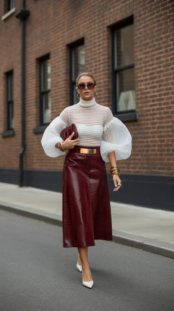 This look stands out through the contrast between a sheer top and a structured leather skirt. The soft upper layer adds delicacy while the skirt introduces strength and depth.