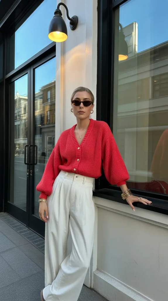 A red cardigan combined with cream trousers creates a cozy yet elegant early spring outfit. The knit adds warmth while the neutral pants keep the look refined.