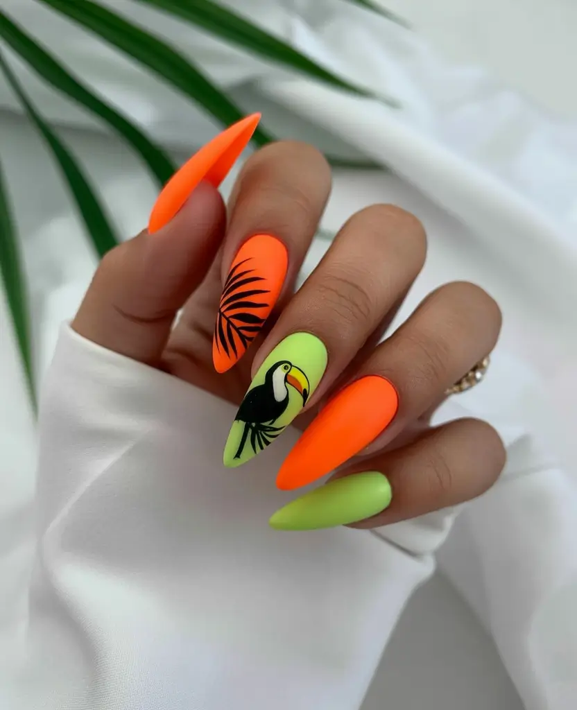 Whenever I want vacation vibes, this is my go-to. Neon orange and green create a strong contrast, and the accent nail adds personality.