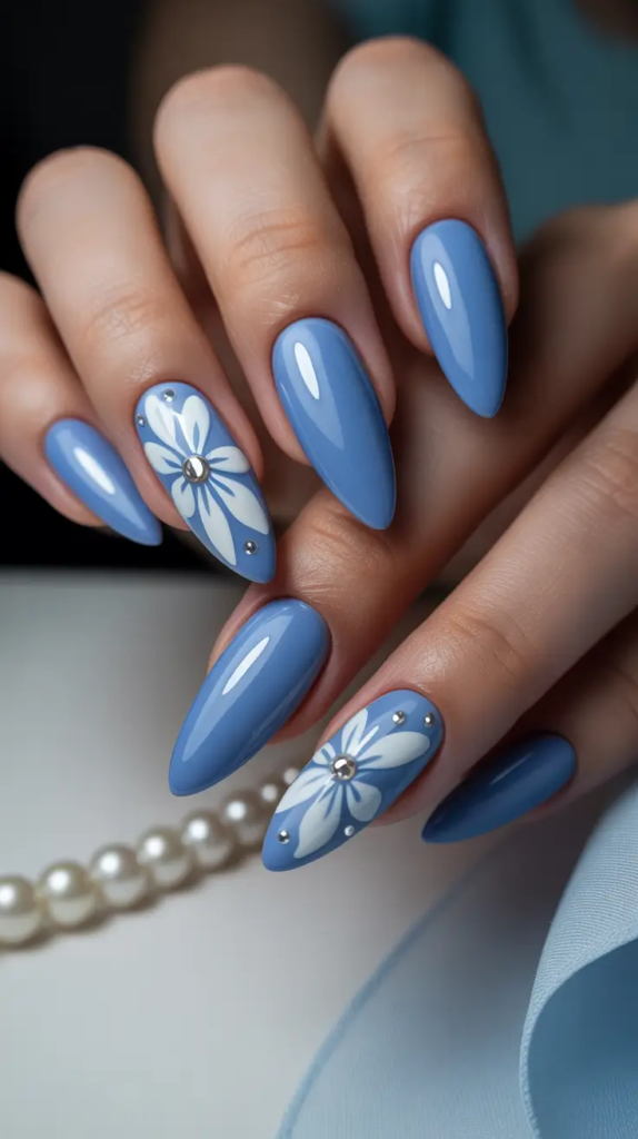 This is my safe option when I don’t want to overthink. A solid blue with a small floral detail looks clean and polished.