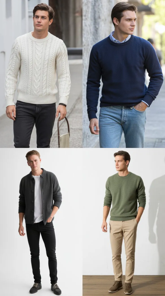 A cardigan adds warmth, and a button-down shirt keeps the look structured. It works well with chinos or trousers.