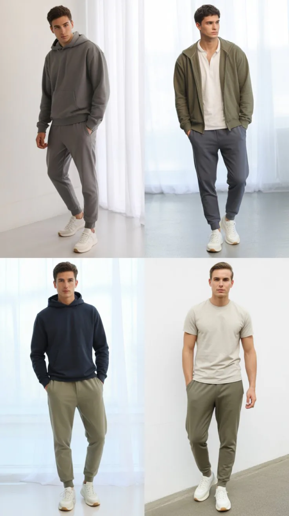 Combining joggers with fitted tees or jackets creates a balanced look. Sneakers complete the outfit.