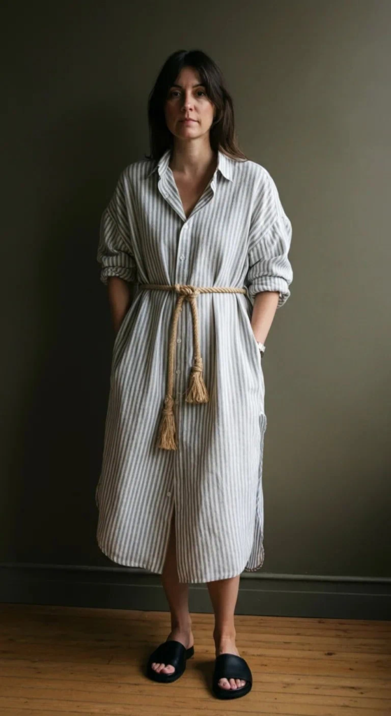 A loose striped linen shirt dress provides relaxed sophistication. A rope belt defines the waist naturally, and leather slides enhance comfort and style for brunches or casual shopping trips.