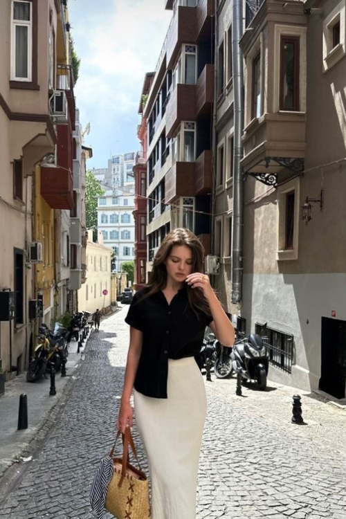 For cooler summer evenings, I wear a light turtleneck with a maxi skirt. It gives full coverage without feeling too warm.