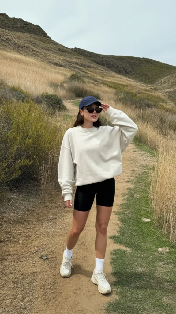 For quick walks or errands, I usually wear biker shorts with a loose sweatshirt. It’s one of my most repeated outfits because it feels easy but still looks intentional. I’ve realized that comfort helps me stay active longer. High-waisted biker shorts also give better support and structure.