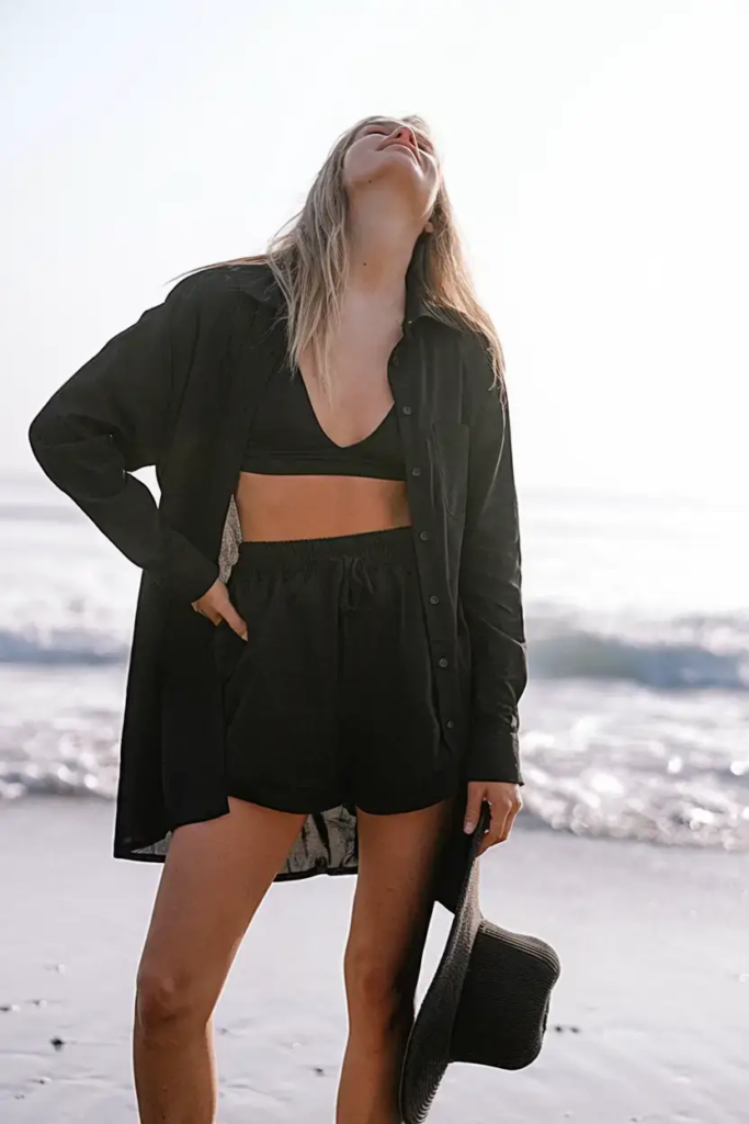 This look shows how a black outfit can still feel light and summery when the fabrics are breathable. Loose drawstring shorts paired with an open shirt create a relaxed shape, while the bralette underneath keeps the outfit balanced between casual and flattering.