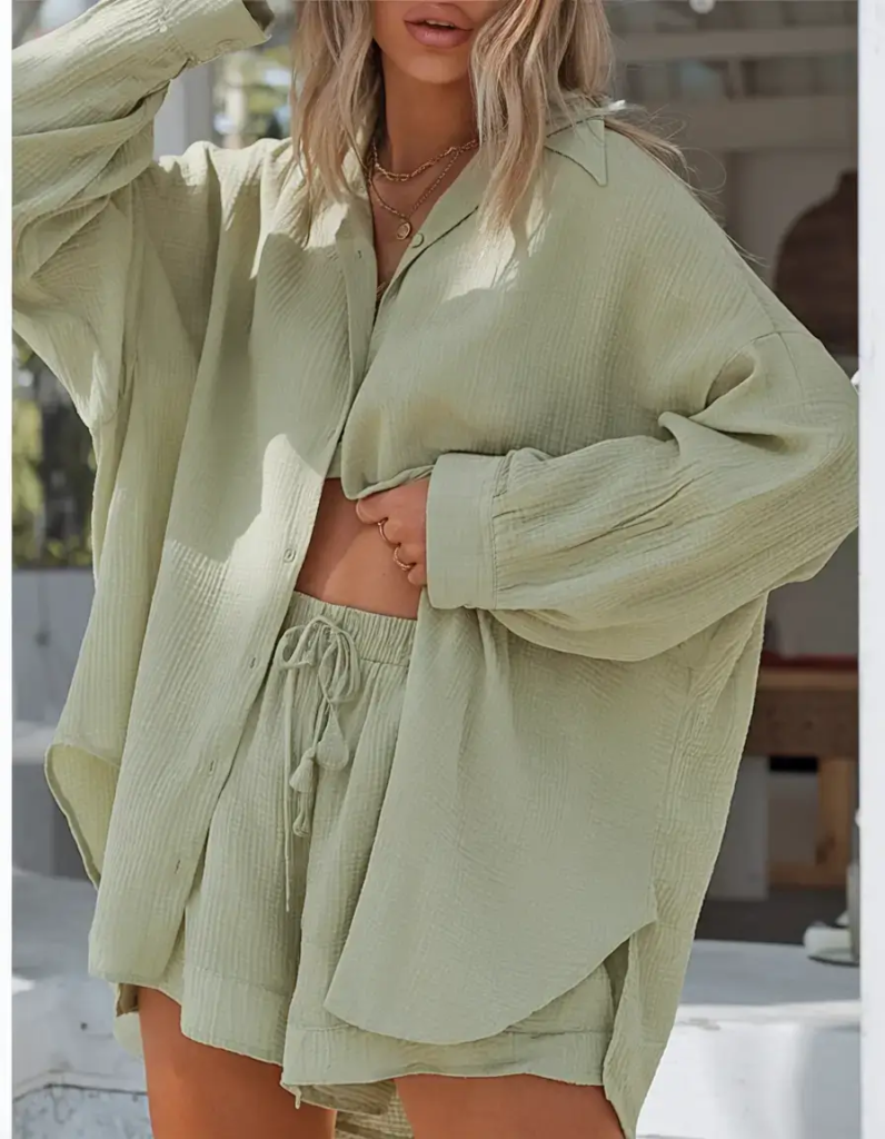 This sage-colored two-piece set highlights how oversized clothing can still look elegant. The loose shirt drapes softly over relaxed shorts with a gathered waistband, creating a comfortable silhouette.