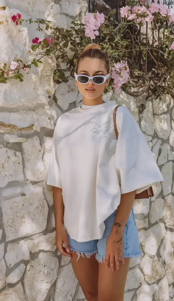 A classic oversized white tee styled with raw-hem denim shorts creates a simple summer outfit. The clean structure of the shirt contrasts nicely with the rugged feel of denim.
