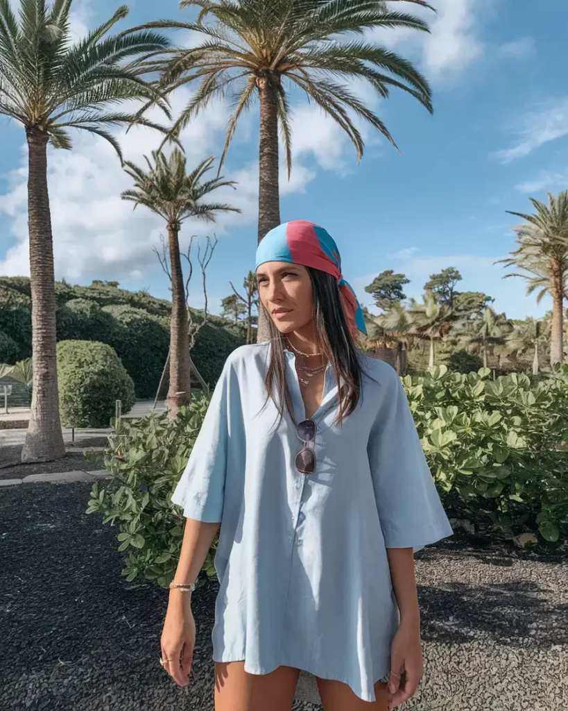 A loose baby blue button-down shirt gives a fresh and airy summer look. Its oversized shape feels relaxed while still looking elegant when styled with small details like a scarf or sunglasses.
