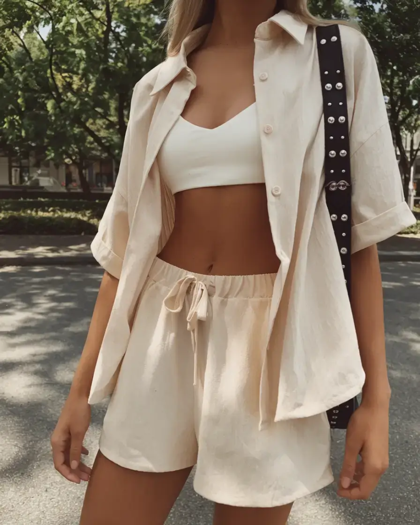 Soft neutral tones create a calm and polished outfit in this look. The relaxed cream set with an oversized shirt and comfortable shorts feels effortless while still looking refined.