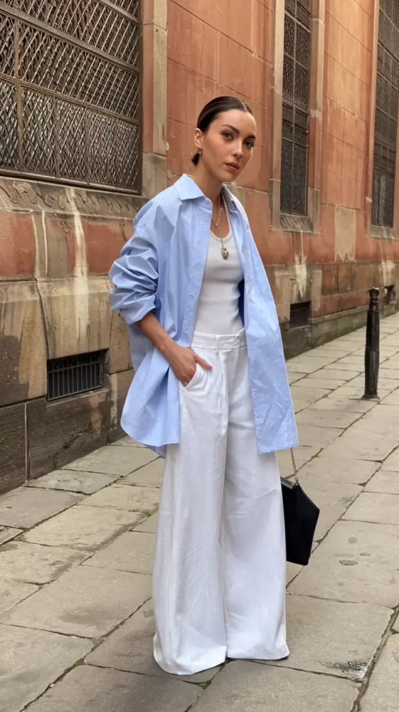 A sky-blue shirt combined with wide white trousers creates a relaxed but elegant outfit. The oversized top softens the look while the structured trousers maintain balance.