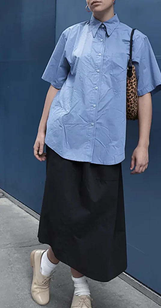 A structured shirt paired with a full midi skirt creates an interesting mix of shapes. The crisp fabric gives the outfit structure while the skirt introduces softness and movement.