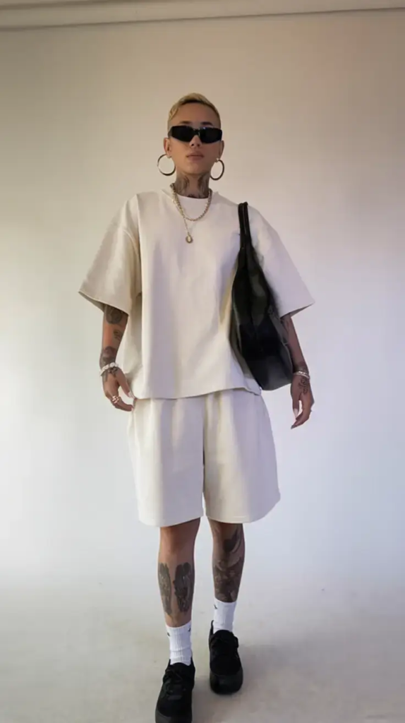 A cream monochrome set with an oversized tee and matching shorts shows how minimal styling can still look strong. The simple color palette gives the outfit a modern streetwear feel.