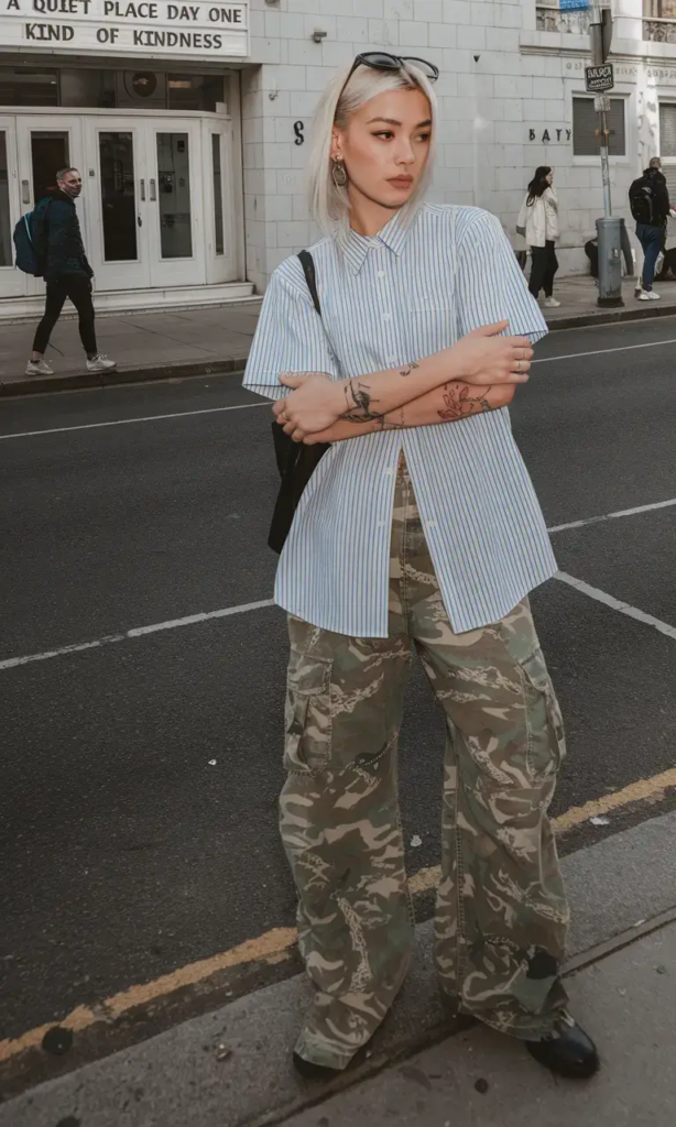 This outfit mixes formal and casual elements by pairing a structured striped shirt with relaxed camouflage pants. The contrast between the two styles creates a bold look.