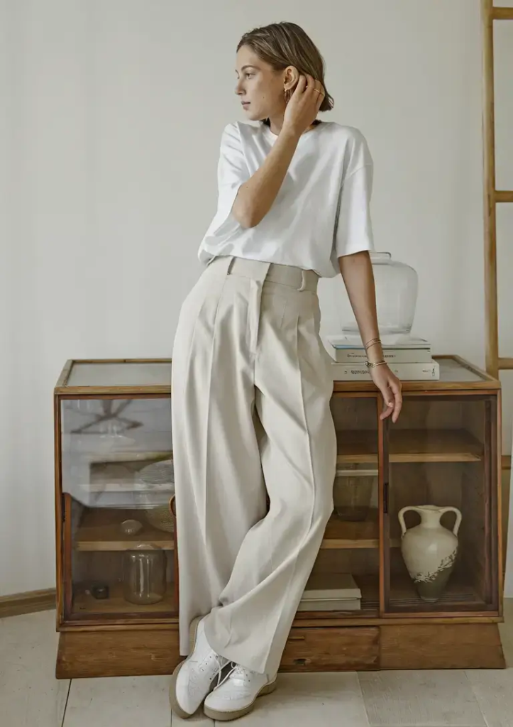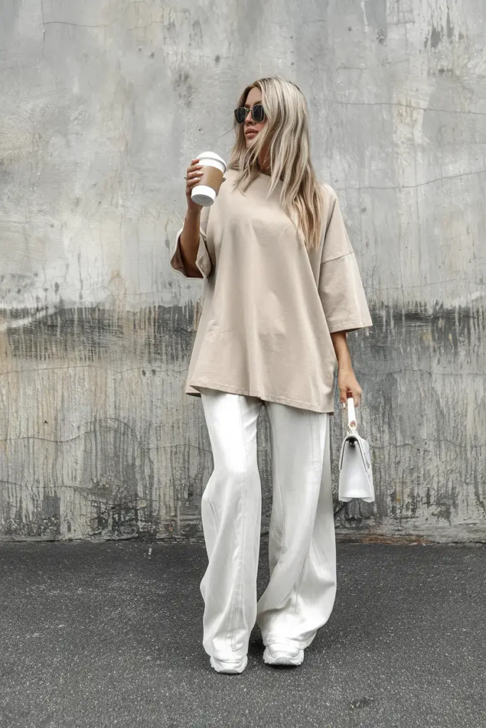 A loose beige tee combined with white wide-leg trousers creates a simple but polished look. The soft contrast between the colors keeps the outfit visually interesting.