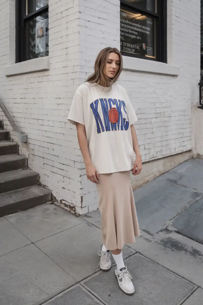 A graphic oversized tee paired with a flowing midi skirt mixes athletic and feminine styles. The contrast between the relaxed top and soft skirt keeps the outfit interesting.