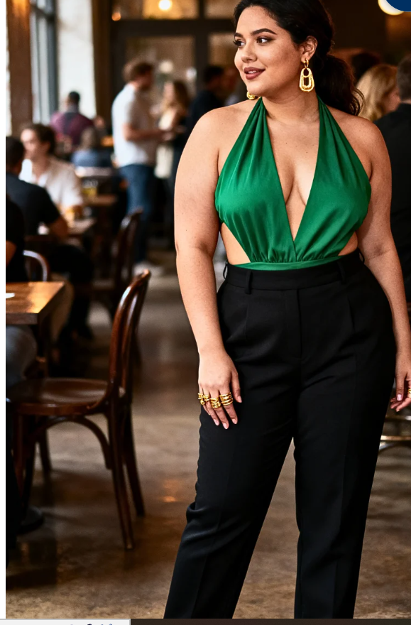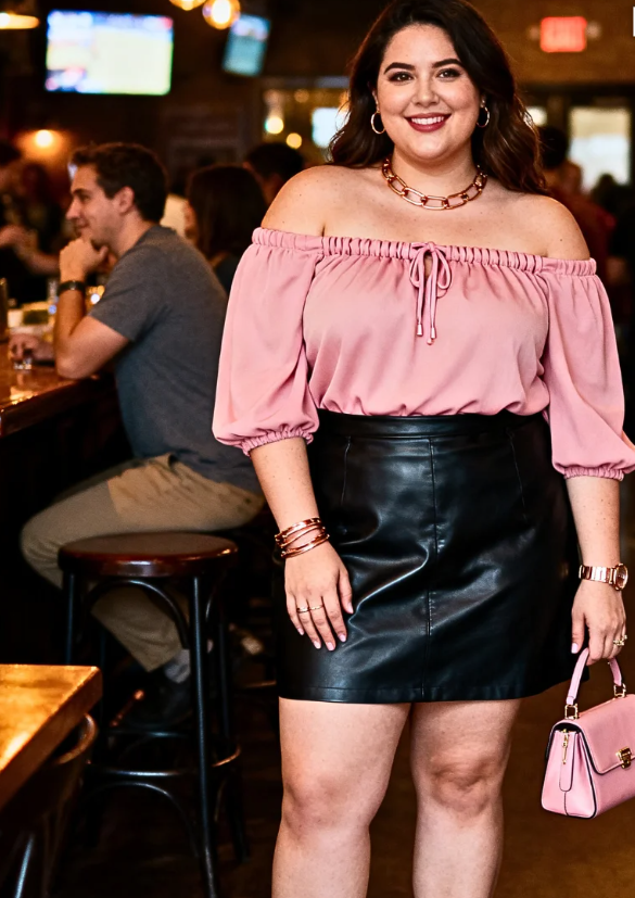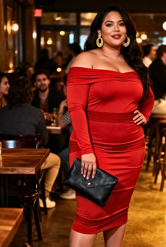 This outfit celebrates curves and confidence, with an off-shoulder neckline that draws attention upward while keeping the look balanced.