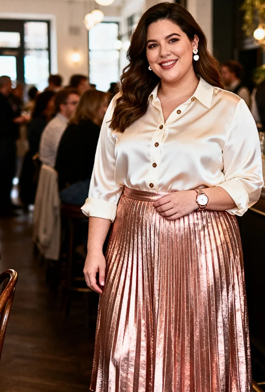 7. Plus Size Metallic Pleated Skirt and Silk Blouse Outfit