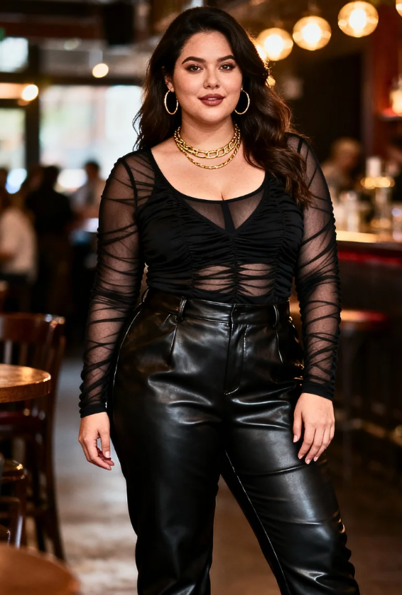 9. Plus Size Ruched Mesh Top and Faux Leather Pants Outfit
