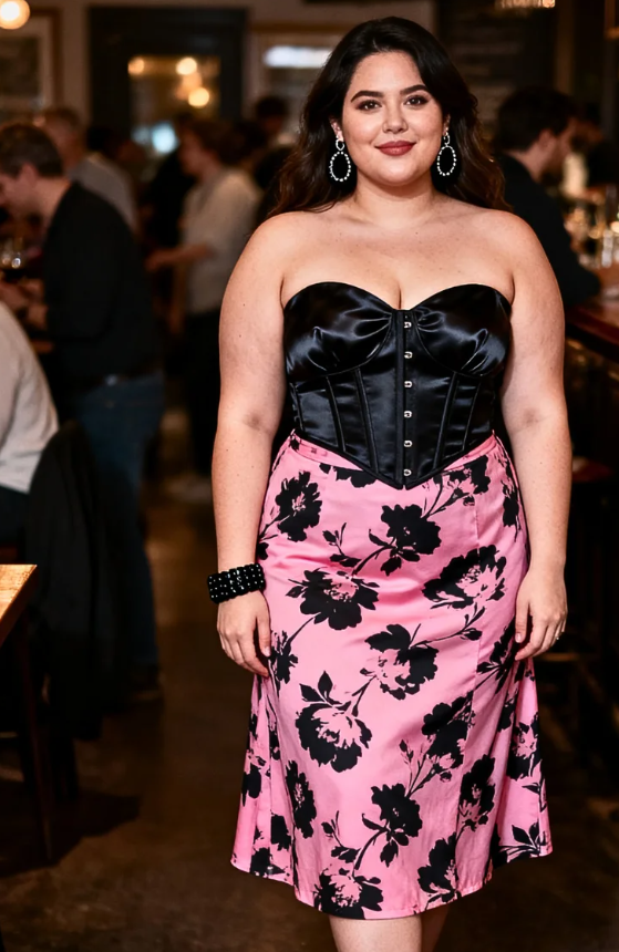10. Plus Size Bustier Top and Printed Midi Skirt Outfit