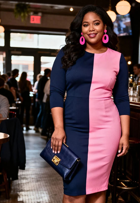 Color blocking is presented as flattering and visually striking, making the dress itself the statement.