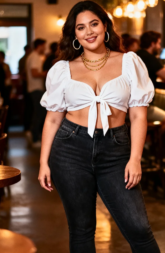 14. Plus Size Tie-Front Crop Top and High-Waisted Jeans Outfit