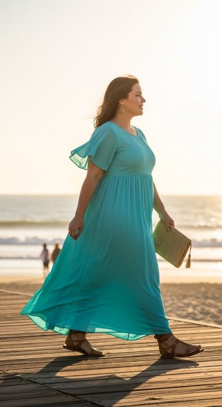 Empire waist dresses sit above the belly, giving comfort without tightness. Turquoise shades feel fresh and work well in sunlight. Maxi length also protects skin from sun exposure.