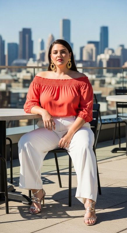 3. Coral Off-Shoulder Top with White Wide-Leg Pants